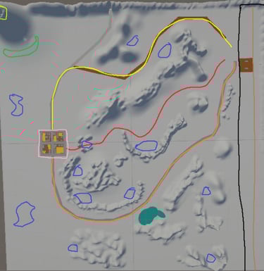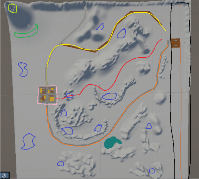 The shortest route from the farm to the village, but also the most dangerous, passing through the highest concentration of enemy camps.Yellow Path:
